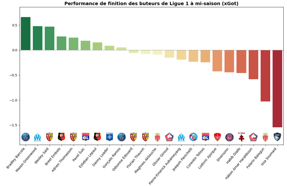 - Score positif : le joueur génère des tirs plus dangereux que ce que la qualité de ses occasions laissait attendre. C’est notamment le cas sur cette 1ère partie de saison de Bradley Barcola, Mason Greenwood et Wesley Saïd.
