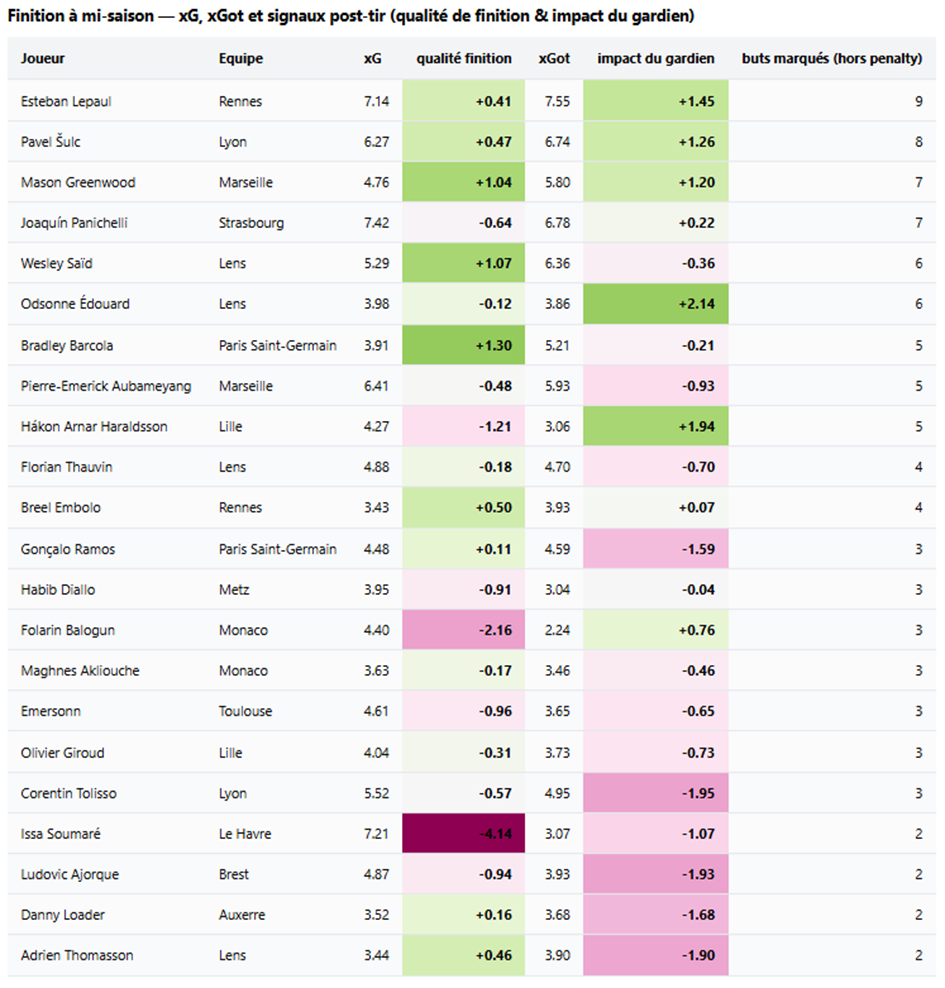Dans cet article, nous proposons une lecture structurée de la finition en Ligue 1 à mi-saison, en distinguant successivement :