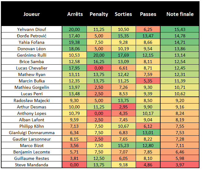 La moyenne des différentes notes, avec une pondération particulière pour les arrêts (coefficient de 4 car le rôle principal du gardien est d’arrêter les tirs de l’équipe adverse) permettra d’obtenir une note finale et de réaliser un classement des portiers de Ligue 1.